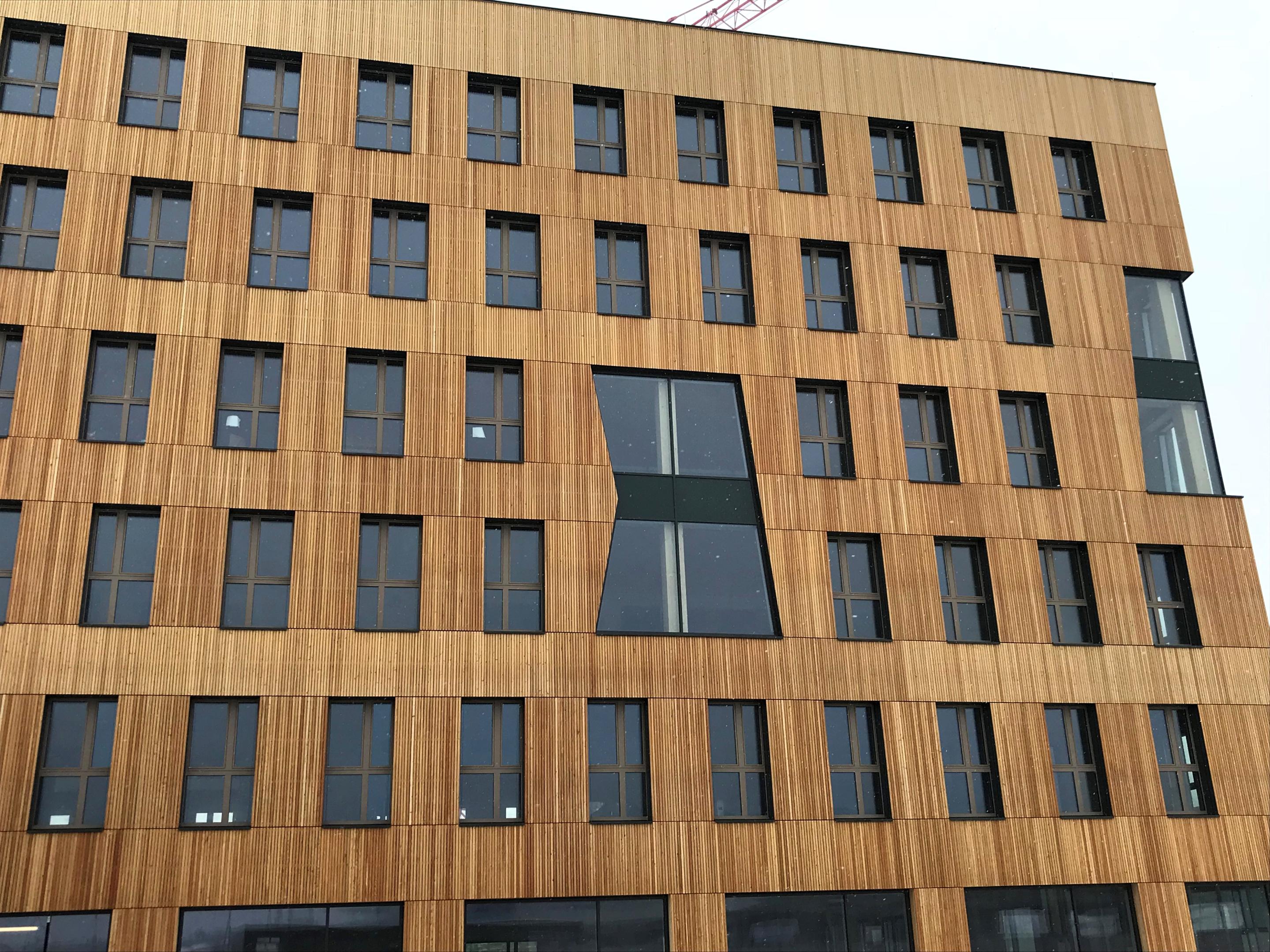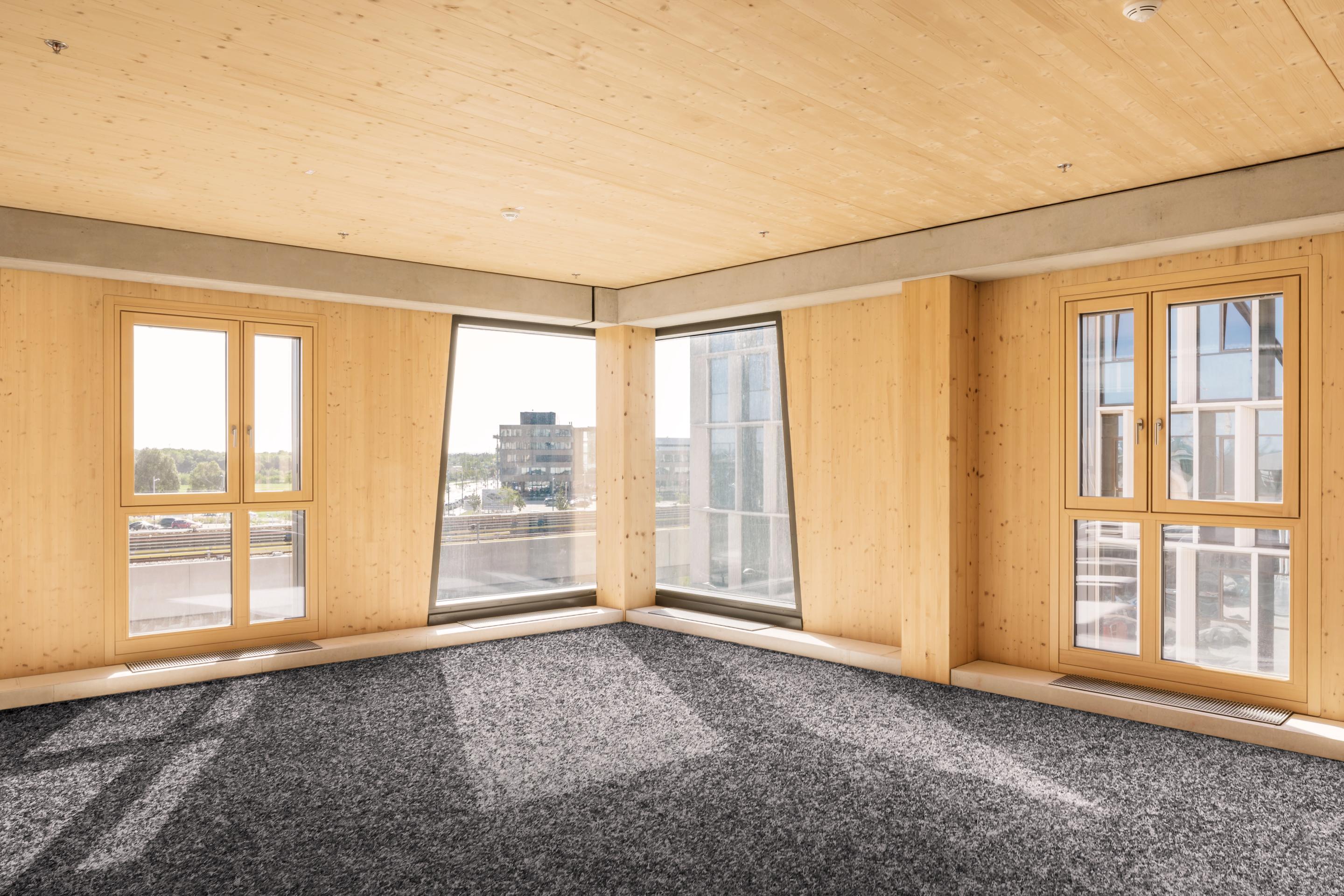 Es wurden 777 blockverklebte Brettschichtholz-Stützen sowie 1.600 m³ Brettsperrholz-Wandelemente in höchster Qualität geliefert.